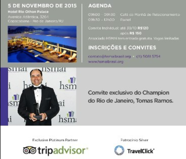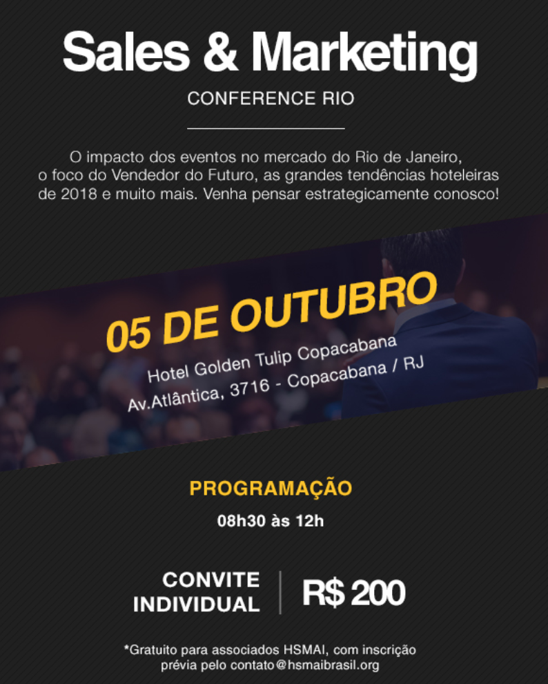 O impacto dos eventos no mercado do Rio de Janeiro, o foco do Vendedor do Futuro, as grandes tendências hoteleiras de 2018 e muito mais. Venha pensar estrategicamente conosco. Confira quem esteve presente no evento anual da HSMAI no Rio, que aconteceu dia 05/10 no Hotel Golden Tulip Copacabana. 60 executivos da indústria assistiram palestras e debateram sobre as tendências do segmento corporativo e de lazer no turismo brasileiro.