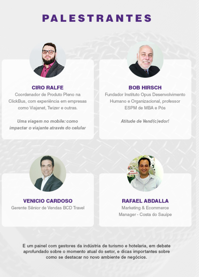 Reinventar-se é premissa básica do Vendedor de Viagens. Esse é o evento ideal para você ter insights e otimizar sua performance de um jeito interativo e dinâmico.